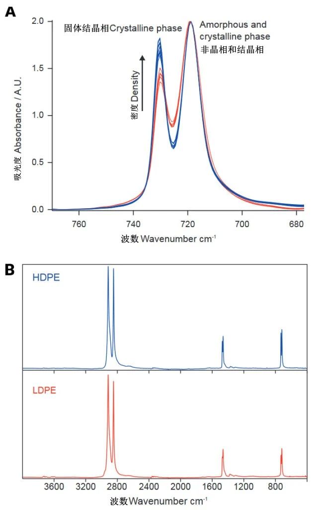 下图(A)表明,随着样品结晶度的上升,730cm-1处的吸光度强度增加。结晶度和密度是相关的,因此,峰值较高(蓝色)的样品可被鉴定为HDPE。峰值较小的红色样品被鉴定为LDPE。